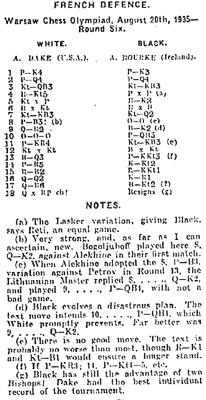 Unfortunately no source is given for the information, but we might guess it was Cranston himself. However it does provide both a 1935 solution as to which Irish player Dake played and an explanation as to how the confusion arose; probably as definitive as it gets. It might be more difficult to determine with certainty whether the game ended with the queen sacrifice or the checkmate.