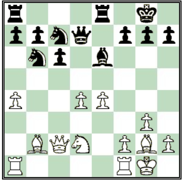 11…e5 12.e4 Nb6 13.Qd3 exd4 14.cxd4 Nfd7 15.Qc2 Nf8 16.Bb2 Ne6 17.Nf3 Nc7 18.a4 Be6 19.Nd2 Qd7