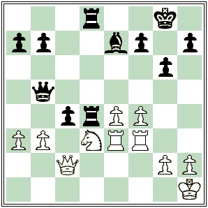 After this move, White offered a draw which, after some hesitation, Black accepted. If 24.b4 then 24…Ng5 25.Rg3 h5 26.fxg5 (If 26.h4 Rxe3 27.Rxe3 (if 27.hxg5 Qxf4 wins) 27…Qxf4+ 28.Rg3 Qxh4+ 29.Rh3 Nxh3 30.gxh3 Re8 winning) 26…h4 winning the Rook.